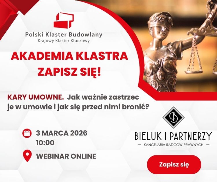 Polski Klaster Budowlany wraz z Kancelarią Radców Prawnych Bieluk i Partnerzy zapraszają na bezpłatne spotkanie online, w ramach cyklu Akademia Klastra poleca, poświęcone praktycznym aspektom kar umownych.