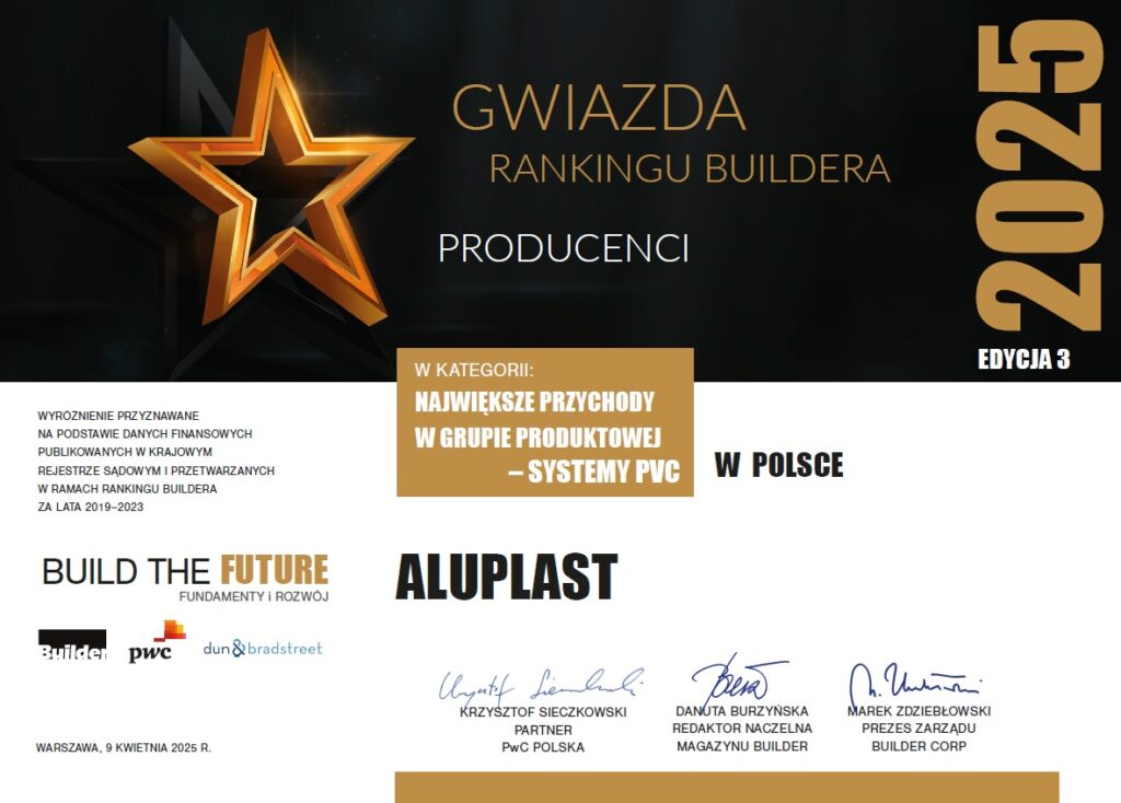 9 kwietnia 2025 r. w Fabryce Norblina w Warszawie miesięcznik „Builder” wręczył wyróżnienia w prestiżowym Rankingu Gwiazdy Buildera 2025. Inicjatywa, organizowana wspólnie przez redakcję miesięcznika Builder Polska ”, PwC Polska oraz Dun & Bradstreet, uhonorowała wyróżniające się przedsiębiorstwa budowlane, które osiągnęły najwyższe pozycje w kluczowych kategoriach. Aluplast otrzymał wyróżnienie Gwiazdy Buildera 2025 w kategorii “NAJWIĘKSZE PRZYCHODY W GRUPIE PRODUKTOWEJ – SYSTEMY PVC”, jako jedna z najbardziej dynamicznie rozwijających się firm w sektorze budowlanym.