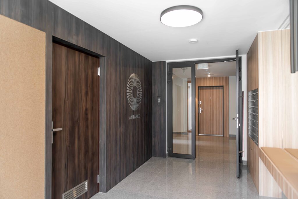 W inwestycji ANTARES od ACTIVA kluczowym elementem było stworzenie przyjaznej, nowoczesnej przestrzeni wspólnej. Jasne drzwi GRADARA U69 w odcieniu naturalnego jesionu podkreślają estetykę wnętrz i wprowadzają spójny, ponadczasowy charakter.