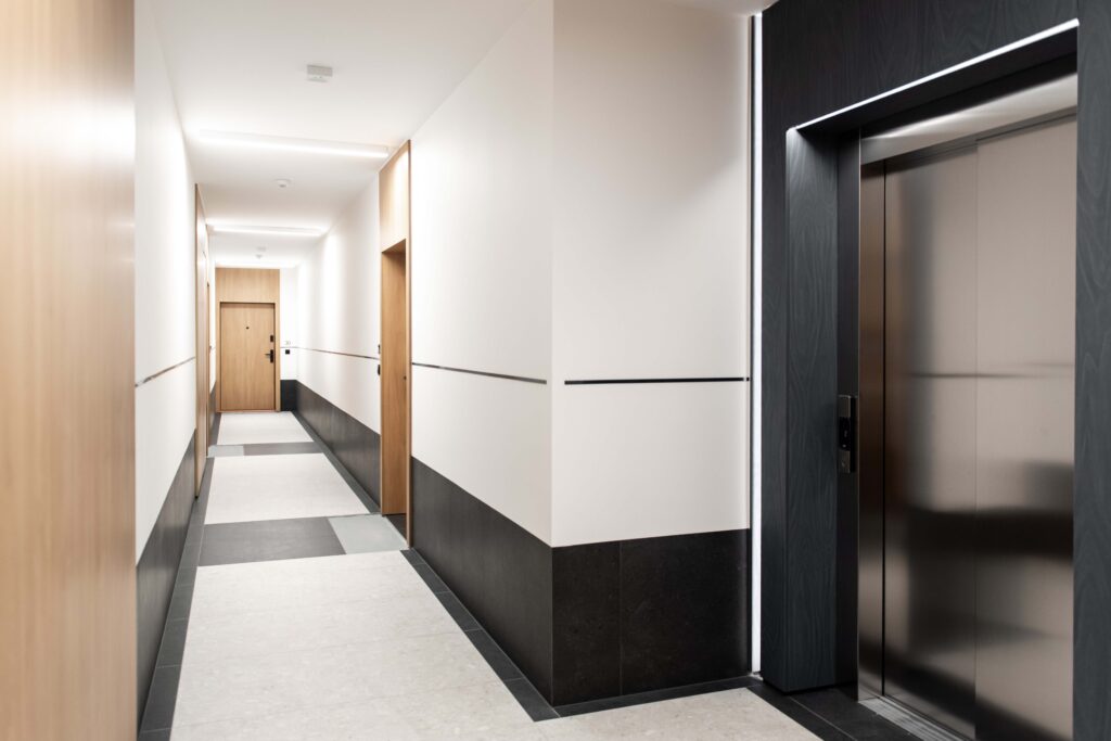 Wybór drzwi został podyktowany zarówno wysokimi parametrami technicznymi (RC3, EI30, akustyka 40 dB), jak i potrzebą zachowania spójności wizualnej przestrzeni wspólnych. Ościeżnice aluminiowe Allure ułatwiły organizację prac, pozwalając zachować tempo wieloetapowej realizacji.