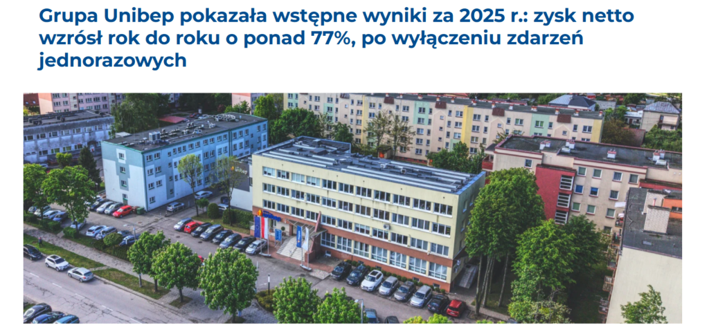 Dla Grupy Unibep rok 2025 był dobry pod względem wyników. Według opublikowanych wstępnych szacunków, po wyłączeniu zdarzeń jednorazowych, zysk brutto ze sprzedaży wyniósł 229,4 mln zł (+29,2% r/r), zysk EBIT 105,4 mln zł (+70,5% r/r), a zysk netto 43,4 mln zł (+77,2% r/r), przy wzroście marży brutto ze sprzedaży do 9,7% z 6,8% rok wcześniej. Na koniec ub. r. wartość portfela zamówień Grupy Unibep sięgnęła 4,0 mld zł, co oznacza wzrost o 29% r/r. Grupa utrzymała również mocną pozycję płynnościową – na koniec 2025 r. dysponowała gotówką netto w wysokości 150 mln zł wobec długu netto wynoszącego 103 mln zł rok wcześniej.