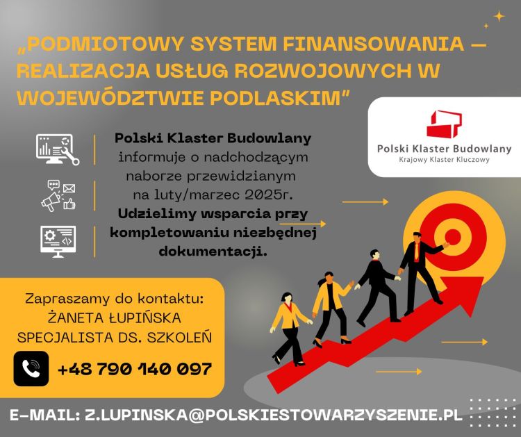 Polski Klaster Budowlany informuje o nadchodzącym naborze przewidzianym na luty/marzec 2025r. do projektu „Podmiotowy System Finansowania – realizacja usług rozwojowych w województwie podlaskim”. Nabór adresowany jest do mikro, małych i średnich przedsiębiorstw w województwie podlaskim oraz ich pracowników. Celem projektu jest wspieranie dostosowania kompetencji i kwalifikacji pracowników.