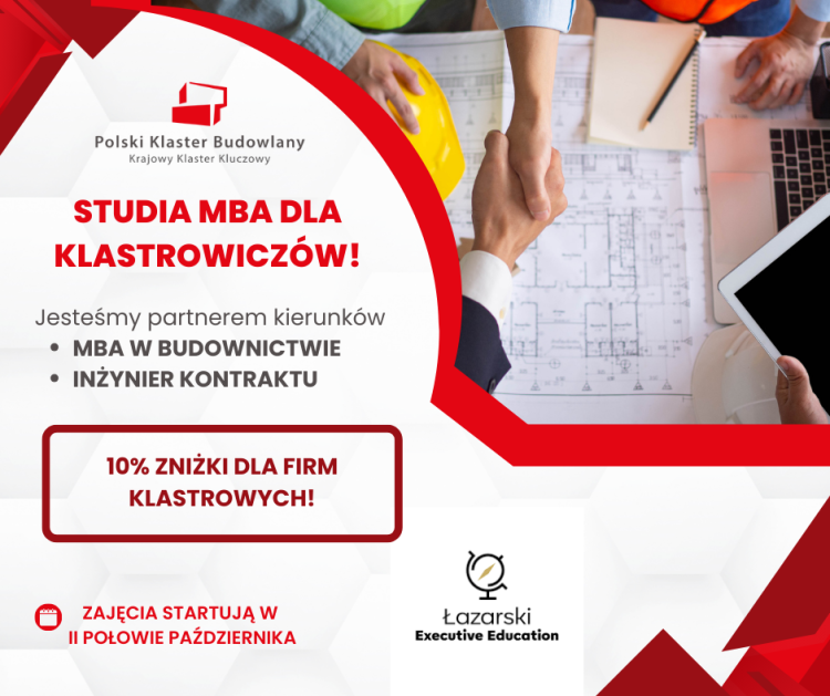 Rozwój kompetencji powinien być dostępny dla każdego ambitnego profesjonalisty. Dlatego też, z myślą o członkach Polskiego Klastra Budowlanego, Uczelnia Łazarskiego przygotowała specjalną zniżkę w wysokości 10% na oba kierunki studiów.