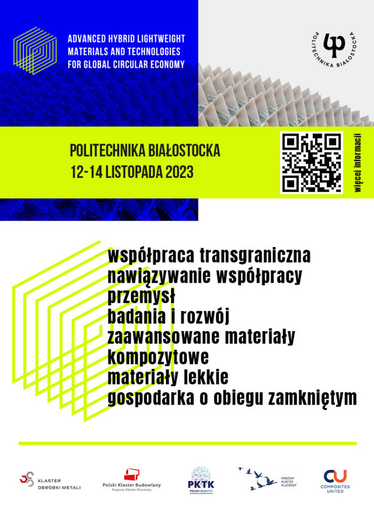 W dn. 12-14 listopada 2023 r. w Białymstoku odbędzie się konferencja Advanced hybrid lightweight materials and technologies for global circular economy. Wydarzenie organizuje Politechnika Białostocka we współpracy z Urzędem Marszałkowskim Województwa Podlaskiego, Krajowymi Klastrami Kluczowymi (Polski Klaster Budowlany, Klaster Obróbki Metali oraz Polski Klaster Technologii Kompozytowych), Fundacją na rzecz rozwoju Politechniki Białostockiej, przy wsparciu międzynarodowego klastra Composite United e.V. oraz ILK TU Dresden.