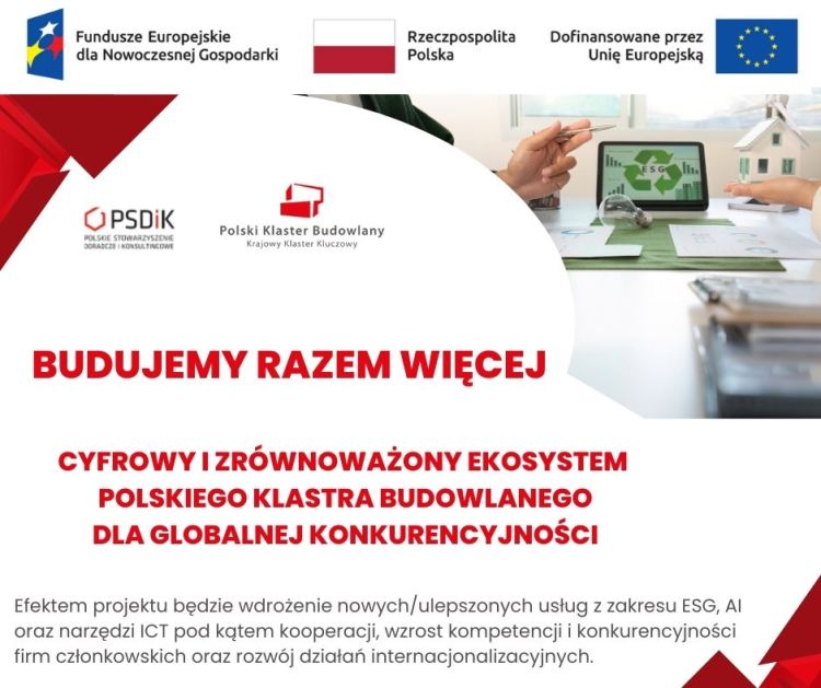 Polskie Stowarzyszenie Doradcze i Konsultingowe uzyskało datację z Unii Europejskiej na projekt „Budujemy Razem Więcej: Cyfrowy i zrównoważony ekosystem Polskiego Klastra Budowlanego dla globalnej konkurencyjności”.