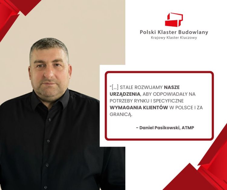 Daniel Pasikowski (ATMP) Naszym głównym celem jest nawiązywanie wartościowych kontaktów z firmami z branży budowlanej oraz pokrewnych sektorów. Wierzymy, że przynależność do Polskiego Klastra Budowlanego umożliwi nam wymianę wiedzy i doświadczeń, a także współpracę przy innowacyjnych projektach. Liczymy również na synergię działań w zakresie promocji i rozwoju naszych produktów, co ułatwi nam ekspansję na nowe rynki i dotarcie do nowych klientów w kraju i za granicą.