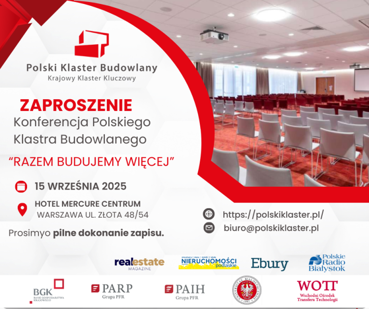 Prowadzimy rejestrację na tegoroczną konferencję Polskiego Klastra Budowlanego, która odbędzie się 15 września 2025 r. w Warszawie, w Hotelu Mercure Centrum, pod hasłem: