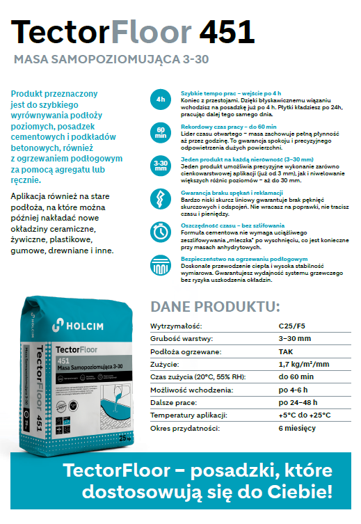 Wprowadzenie TectorFloor 451 wpisuje się w szerszą strategię rozwoju systemowych rozwiązań podłogowych Holcim. Linia TectorFloor stanowi kompleksową ofertę podkładów cementowych, odpowiadających na potrzeby wykonawców w zakresie szybkości realizacji, trwałości oraz elastyczności zastosowań.