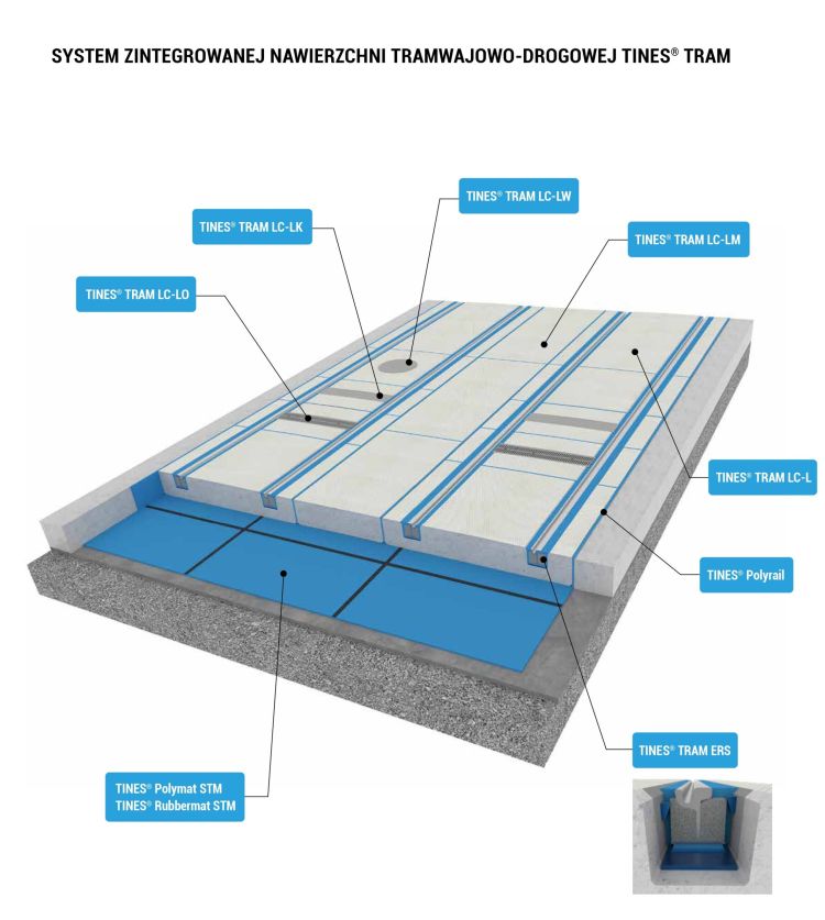 W ramach tej inwestycji TINES dostarczy maty wibroizolacyjne TINES® Rubbermat STM oraz system zintegrowanej nawierzchni tramwajowo-drogowej TINES® TRAM, w którego skład wchodzą prefabrykowane płyty torowo-drogowe TINES® TRAM LC-L oraz system przytwierdzenia szyny w otulinie TINES® TRAM ERS.