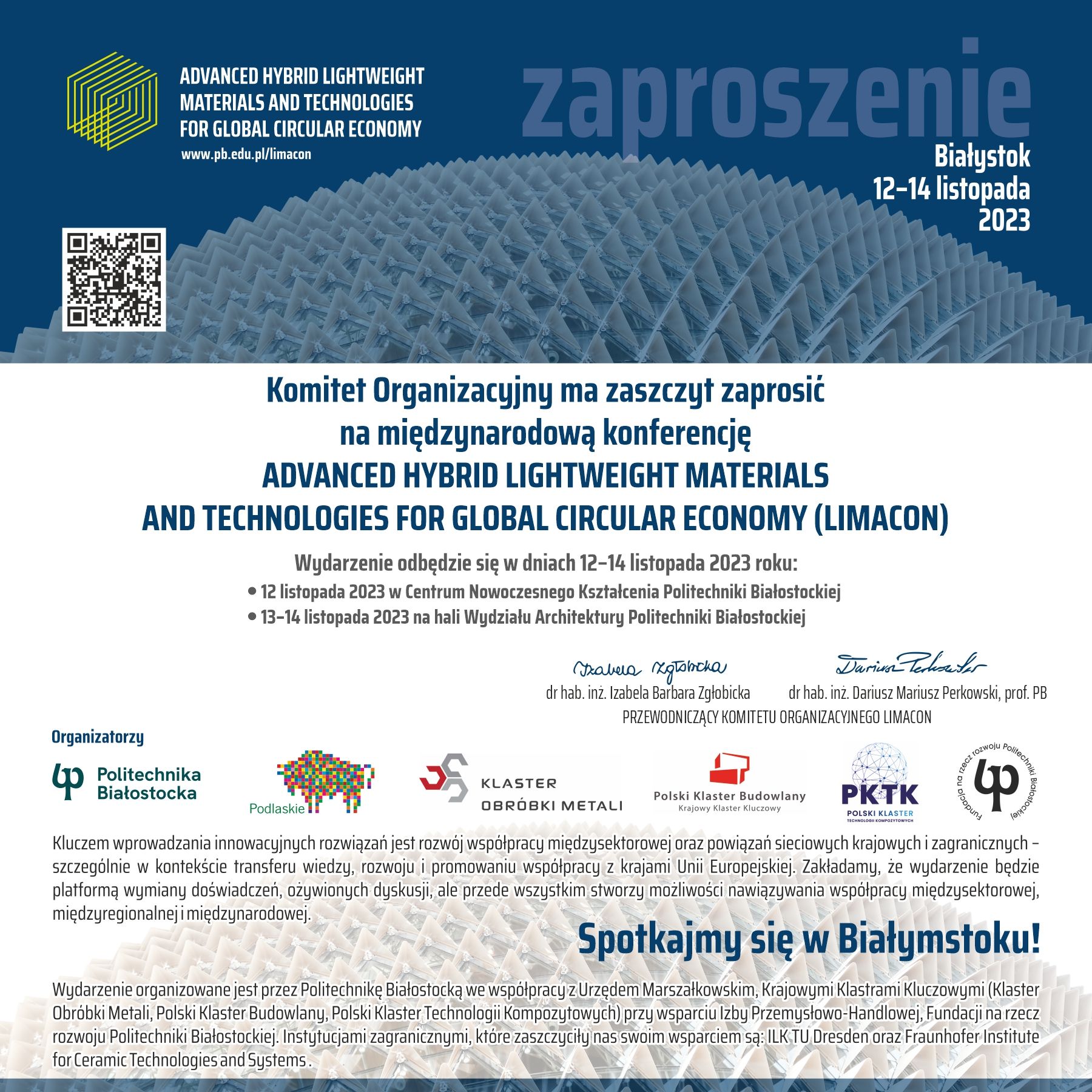 W dn. 12-14 listopada 2023 r. w Białymstoku odbędzie się konferencja Advanced hybrid lightweight materials and technologies for global circular economy. Wydarzenie organizuje Politechnika Białostocka we współpracy z Urzędem Marszałkowskim Województwa Podlaskiego, Krajowymi Klastrami Kluczowymi (Polski Klaster Budowlany, Klaster Obróbki Metali oraz Polski Klaster Technologii Kompozytowych), Fundacją na rzecz rozwoju Politechniki Białostockiej, przy wsparciu międzynarodowego klastra Composite United e.V. oraz ILK TU Dresden.