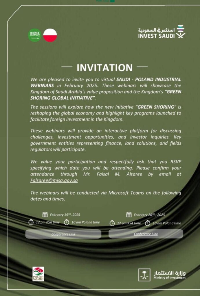 w dniach 19 i 26 lutego br. saudyjskie Ministerstwo Inwestycji we współpracy z Ambasadą RP w Rijadzie organizuje polsko-saudyjskie webinarium biznesowe, które pozwoli zapoznać się z możliwościami współpracy z saudyjskimi firmami i instytucjami państwowymi.